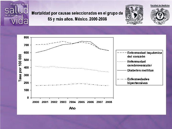 Mortalidad en el adulto mayor en México • En el año 1900, el total de muertes en la población de 65 años y más en México, representó apenas el 8. 3 % del total de defunciones; para 1980 subió hasta el 31%; y en el año 2008 las defunciones en este grupo fueron más de la mitad del total (54%). • La evolución de la mortalidad por grupos de edad deja ver que la tasa de mortalidad infantil a principio de siglo XX era 2. 4 veces la del grupo de 65 años y más; y para 2008, la relación se invirtió, la tasa del grupo de adultos mayores fue tres veces la tasa de menores de un año de edad.