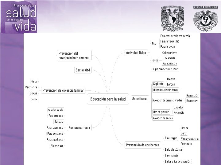 1. Promoción de la Salud • • • • • 1. 1 Incorporación al Programa de Salud 1. 2 Alimentación correcta 1. 3 Actividad Física 1. 4 Salud bucal 1. 5 Salud sexual y reproductiva 1. 6 Envejecimiento saludable 1. 7 Higiene postural (corrección de defectos posturales) 1. 8 Prevención y tratamiento de adicciones (tabaquismo, alcoholismo y farmacodependencia) 1. 9 Violencia familiar 1. 10 Prevención de accidentes (con énfasis en caídas) 1. 11 Infecciones de transmisión sexual, VIH-SIDA 1. 12 Prevención de tuberculosis 1. 13 Prevención de cáncer cérvico-uterino y mamario 1. 14 Enfermedades prostáticas 1. 15 Sobrepeso, obesidad, diabetes mellitus, hipertensión arterial y dislipidemias 1. 16 Entorno favorable a la salud (vivienda, área de trabajo y patio limpio) 1. 17 Dueños responsables con animales de compañía 1. 18 Incorporación a grupos de ayuda mutua (sobrepeso, obesidad, diabetes mellitus, hipertensión arterial y adicciones