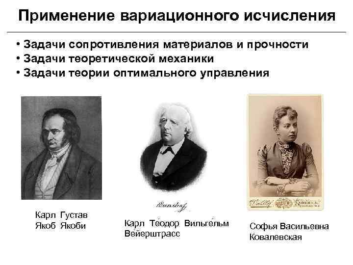 Применение вариационного исчисления • Задачи сопротивления материалов и прочности • Задачи теоретической механики • Задачи теории оптимального управления Карл Густав Якоби Карл Те одор Вильге льм Ве йерштрасс Софья Васильевна Ковалевская