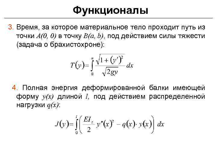 Функционалы 3. Время, за которое материальное тело проходит путь из точки A(0, 0) в точку B(a, b), под действием силы тяжести (задача о брахистохроне): 4. Полная энергия деформированной балки имеющей форму y(x) длиной l, под действием распределенной нагрузки q(x):