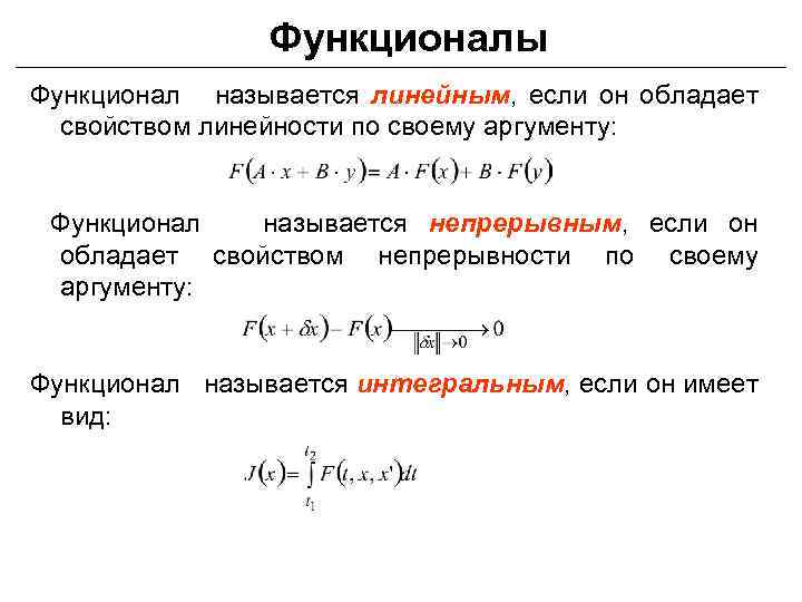 Функционалы Функционал называется линейным, если он обладает свойством линейности по своему аргументу: Функционал называется непрерывным, если он обладает свойством непрерывности по своему аргументу: Функционал называется интегральным, если он имеет вид: