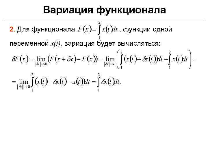 Вариация функционала 2. Для функционала , функции одной переменной x(t), вариация будет вычисляться: