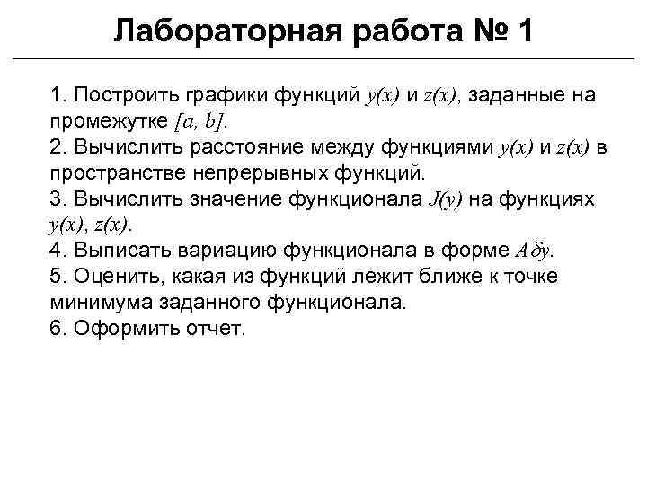 Лабораторная работа № 1 1. Построить графики функций y(x) и z(x), заданные на промежутке [a, b]. 2. Вычислить расстояние между функциями y(x) и z(x) в пространстве непрерывных функций. 3. Вычислить значение функционала J(y) на функциях y(x), z(x). 4. Выписать вариацию функционала в форме Ady. 5. Оценить, какая из функций лежит ближе к точке минимума заданного функционала. 6. Оформить отчет.