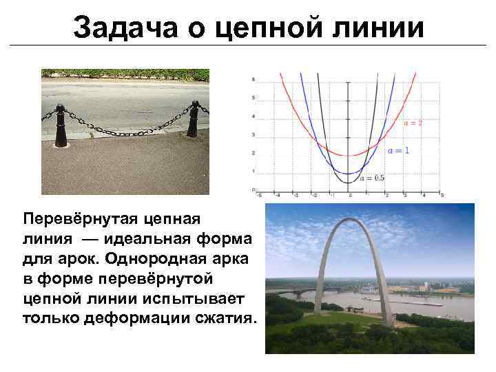 Задача о цепной линии Перевёрнутая цепная линия — идеальная форма для арок. Однородная арка в форме перевёрнутой цепной линии испытывает только деформации сжатия.
