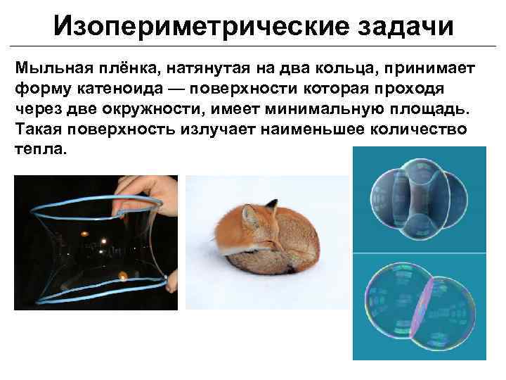 Изопериметрические задачи Мыльная плёнка, натянутая на два кольца, принимает форму катеноида — поверхности которая проходя через две окружности, имеет минимальную площадь. Такая поверхность излучает наименьшее количество тепла.