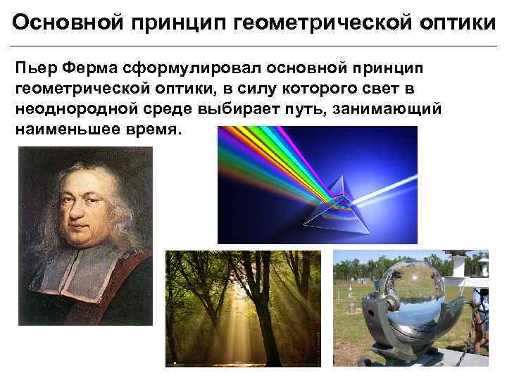 Основной принцип геометрической оптики Пьер Ферма сформулировал основной принцип геометрической оптики, в силу которого свет в неоднородной среде выбирает путь, занимающий наименьшее время.