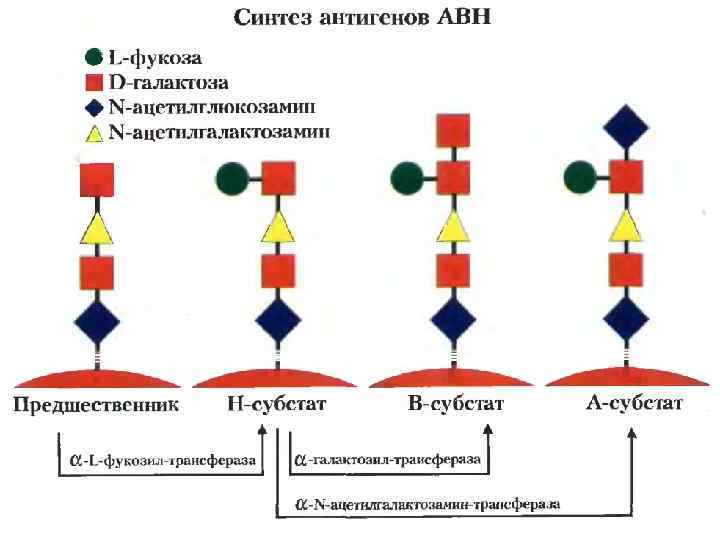 • Ген А кодирует синтез а 1, 3 -ацетилгалактозаминтрансферазы, • Ген В кодирует а 1, 3 -галактозилтрансферазы • Трансферазы, кодируемые генами А и В, способны присоединять соответствующие остатки сахара к галактозе, в том случае, если сердцевинная цепь уже преобразована в Н-антиген.