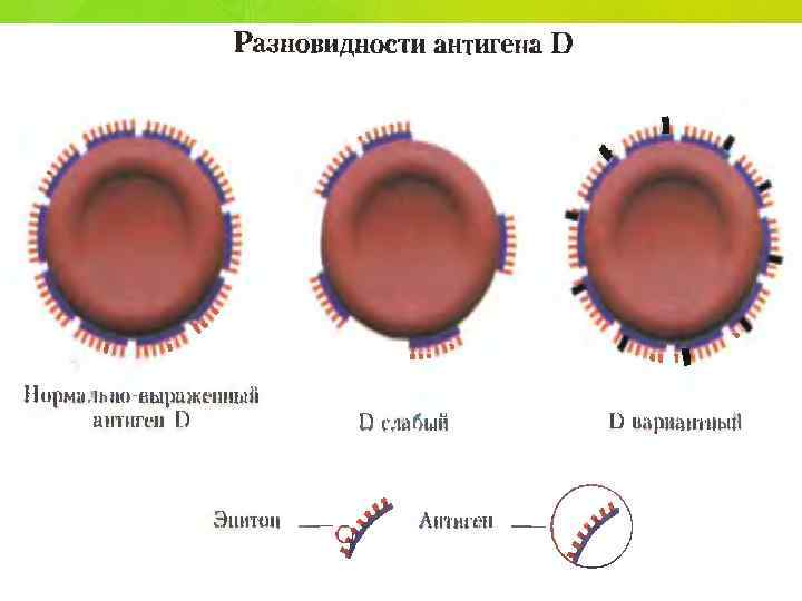 Разновидности антигена D • D слабый - характеризуется сниженным количеством детерминант антигена D (при нормальном количестве 10 000 - 35 000 детерминант на одном эритроците); • D вариантный - отсутствие некоторых эпитопов или мутации гена