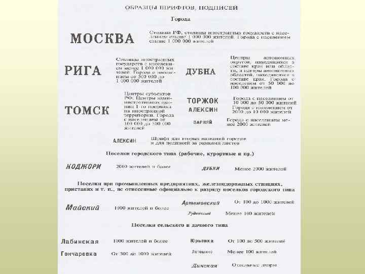 Населенные пункты на топографических картах масштабов 1: 25 000 – 1: 100 000 показывают все. Рядом с изображением населенного пункта подписывается его название: города – прописными буквами прямого шрифта, а населенного пункта сельского типа – строчными буквами более мелкого шрифта. Под названием населенного пункта сельского типа указывается число домов (если известно), а при наличии в них районного и сельского Советов – их сокращенная подпись (PC, CC). названия городских и дачных поселков печатают на картах прописными буквами наклонного шрифта. При изображении населенных пунктов на картах сохраняют их внешние очертания и характер планировки, выделяют главные и сквозные проезды, промышленные предприятия, выдающиеся здания и другие постройки, имеющие значение ориентиров. Широкие улицы и площади, изображающиеся в масштабе карты, показывают масштабными условными знаками в соответствии с их действительными размерами и конфигурацией, другие улицы – условными внемасштабными знаками, главные (магистральные) улицы выделяются на карте более широким просветом.