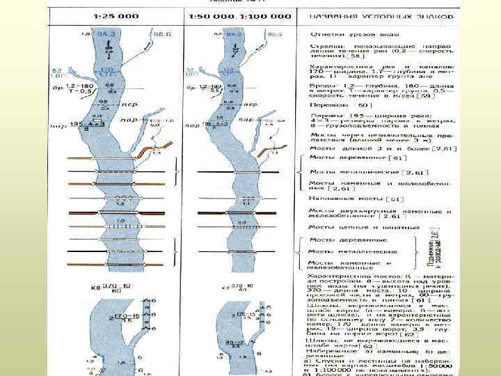 ГИДРОГРАФИЯ (ВОДНЫЕ ОБЪЕКТЫ) На топографических картах показывают прибрежную часть морей, озера, реки, каналы (канавы), ручьи, колодцы, источники, пруды и другие водоемы. Рядом с ними подписы вают их названия. Чем крупнее масштаб карты, тем подробнее изображаются водные объекты. Озера, пруды и другие водоемы показывают на картах, если их площадь составляет 1 мм 2 и более в масштабе карты. Водоемы меньших размеров показывают лишь в засушливых и пустынных районах, а также в тех случаях, когда они имеют значение надежных ориентиров. Реки, ручьи, каналы и магистральные канавы на топографических картах показывают все. При этом установлено, что на картах масштабов 1: 25 000 и 1: 50 000 реки шириной до 5 м, а на картах масштаба 1: 100 000 – до 10 м обозначают одной линией, более широкие реки – двумя линиями. Каналы и канавы шириной 3 м и более изображают двумя линиями, шириной менее 3 м – одной. Ширину и глубину рек (каналов) в метрах подписывают в виде дроби: в числителе – ширина, в знаменателе – глубина и характер грунта дна. Такие подписи помещаются в нескольких местах на протяжении реки (канала). Скорость течения рек (м/с), изображаемых двумя линиями, указывают в середине стрелки, показывающей направление течения. На реках и озерах подписывают также высоту уровня воды в межень по отношению к уровню моря (отметки урезов воды). На реках и каналах показывают плотины, шлюзы, паромы (перевозы), броды и дают соответствующие им характеристики. Колодцы обозначают кружками синего цвета, рядом с которыми помещается буква К или подпись арт. к. (артезианский колодец). Наземные водопроводы показывают сплошными линиями синего цвета с точками (через 8 мм), а подземные – прерывистыми линиями. Чтобы легче отыскать и выбрать по карте источники водоснабжения в степных и пустынных районах, главные колодцы выделяют более крупным условным знаком. Кроме того, при наличии данных слева от условного знака колодца дается пояснительная подпись отметки уровня земли, справа – глубины колодца в метрах и скорости наполнения в литрах за час.