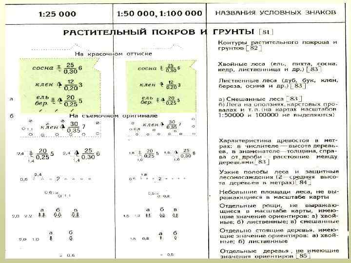 ПОЧВЕННО-РАСТИТЕЛЬНЫЙ ПОКРОВ Почвенно растительный покров изображают на картах обычно масштабными условными знаками. К ним относятся условные знаки лесов, кустарников, садов, парков, лугов, болот и солончаков, а также условные знаки, изображающие характер почвенного покрова: пески, каменистая поверхность, галечники и т. п. При обозначении почвенно-растительного покрова часто применяют сочетание условных знаков. Например, для того чтобы показать заболоченный луг с кустами, контуром обозначают участок, занимаемый лугом, внутри которого помещают условные знаки болота, луга и кустов. Лес, кустарники. Площадь леса внутри контура закрашивают зеленой краской. Породу дерева показывают значком лиственного, хвойного дерева или их сочетанием, когда лес смешанный. При наличии данных о высоте, толщине деревьев и густоте леса указывается его характеристика пояснительными подписями и цифрами. Например, подпись обозначает, что в данном лесу преобладает хвойная порода деревьев (сосна), их средняя высота 25 м, средняя толщина 30 см, среднее расстояние между стволами деревьев 4 м. При изображении на карте просек указывают их ширину в метрах. Площади, покрытые порослью леса (высота до 4 м), сплошным кустарником, лесные питомники внутри контура на карте заполняют соответствующими условными знаками и закрашивают бледно зеленой краской. На участках сплошных кустарников, при наличии данных, специальными значками показывают породу кустарника и подписывают его среднюю высоту в метрах. Болота изображают на картах горизонтальной штриховкой синего цвета с разделением их по степени проходимости в пешем порядке на проходимые (прерывистая штриховка), труднопроходимые и непроходимые (сплошная штриховка). Проходимыми принято считать болота глубиной не более 0, 6 м; глубину их на картах обычно не подписывают. Глубина труднопроходимых и непроходимых болот подписывается рядом с вертикальной стрелкой, указывающей место промера. Труднопроходимые и непроходимые болота показываются на картах одинаковым условным знаком. .
