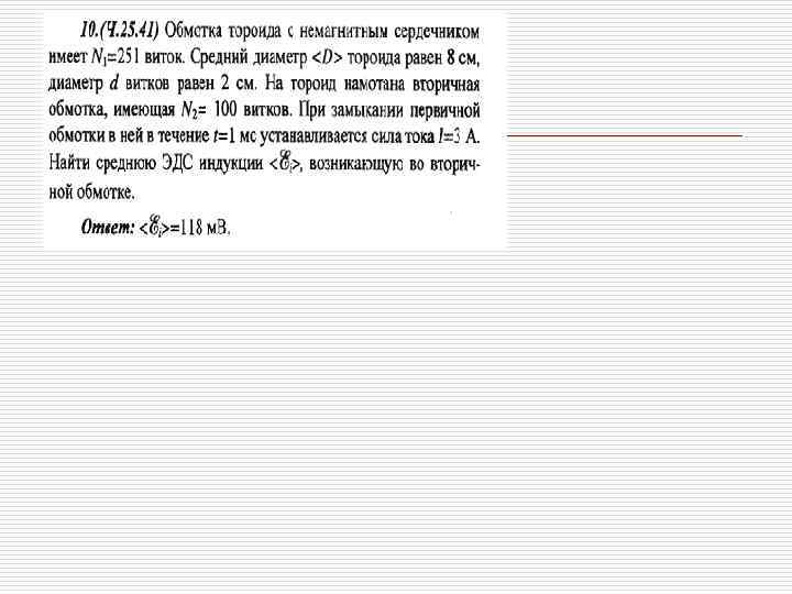 9. ВЗАИМНАЯ ИНДУКТИВНОСТЬ Найдем взаимную индуктивность двух катушек, намотанных на общий замкнутый ферромагнитный сердечник. Линии магнитной индукции сосредотачиваются внутри сердечника (магнитное экранирование), величина магнитной индукции одинакова в каждой точке сердечника. Если первая обмотка имеет N 1 витков и по ней течет ток I 1, то согласно теореме о циркуляции Магнитный поток через поперечное сечение сердечника равен