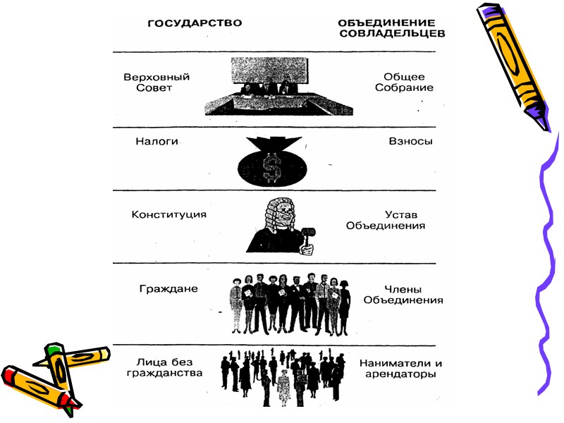 Основные понятия Любая организация (коммуна, громада, орган самоорганизации) предполагает наличие основных факторов: Собственность, имущество громады – единая неделимая собственность людей, живущих на определенной территории (место удовлетворения коллективных потребностей громады – земля, строения, предприятия, коммуникации и т.д.); Финансирование ( содержание собственности, вложение средств в имущество) – налоги, взносы; Управление собственностью ( орган управления имуществом – совет и дирекцию, комитет) .