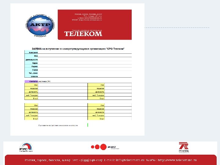 Кто приглашается к участию в «СРО Телеком» 1. Организации телерадиовещания и провайдеры услуг распределения телерадиосигналов и услуг широкополосного доступа 2. Системные интеграторы в области телерадиовещания и систем передачи данных 3. Операторы связи, сетей передачи данных 4. Организации строящие, проектирующие и эксплуатирующие системы видеонаблюдения и обеспечения безопасности, комплексы охраннопожарной сигнализации и т. д. 5. Системные интеграторы в области АСУТП, автоматизации производства, промышленных сетей связи 6. Операторы систем удаленного мониторинга (ситуационные системы, системы телеметрии и т. д. ) 7. Строительные компании (заказчики и девелоперы)