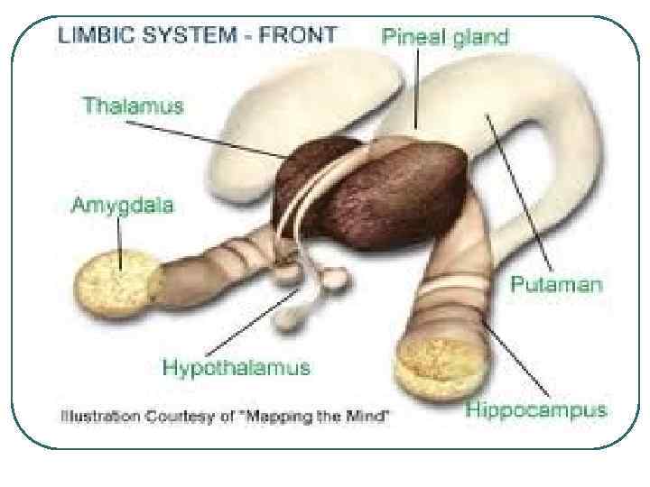 Лимбическая система. l Лимбическая система имеет вид кольца и расположена на границе новой коры и ствола мозга. l В функциональном отношении под лимбической системой понимают объединение различных структур конечного, промежуточного и среднего мозга, обеспечивающее эмоционально-мотивационные компоненты поведения и интеграцию висцеральных функций организма. В эволюционном аспекте лимбическая система сформировалась в процессе усложнения форм поведения организма, перехода от жестких, генетически запрограммированных форм поведения к пластичным, основанным на обучении и памяти. l Структурно-функциональная организация лимбической системы. обонятельная луковица, поясная извилина, парагиппокампальная извилина, зубчатая извилина, гиппокамп, миндалевидное тело, гипоталамус, сосцевидное тело, мамилярные тела. l