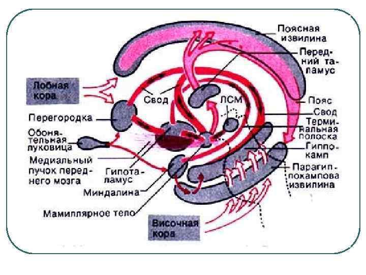 Важнейшим циклическим образованием лимбической системы является круг Пейпеца. Он начинается от гиппокампа через свод к мамиллярным телам, затем к передним ядрам таламуса, далее в поясную извилину и через парагиппокампальную извилину обратно к гиппокампу. l Перемещаясь по этому контуру, возбуждение создает длительные эмоциональные состояния и "щекочет нервы", пробегая сквозь центры страха и агрессии, наслаждения и отвращения. l Этот круг играет большую роль в формировании эмоций, обучении и памяти.