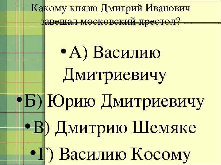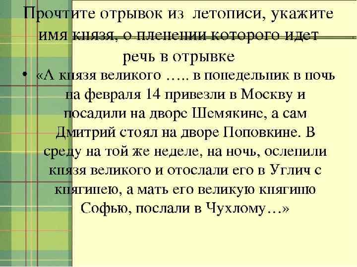 Самостоятельная работа по теме: «Московское княжество в первой половине 15 в. » 1. Дайте определение термину «Поместье» . 2. Запишите три основных вида ремесла в Московском княжестве. 3. Запишите по два примера экспорта и импорта в Московском княжестве в 15 . веке.