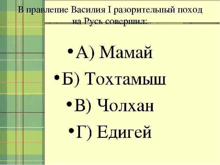 • 1. Крупнейшим городом Волжской Булгарии в золотоордынский период был: 1. Биляр 2. Сувар 3. Ошель 4. Болгар • 2. Из перечисленного ниже результатом распада Золотой Орды не является образование: 1. Сибирского ханства 2. Ногайской Орды 3. Крымского ханства 4. Великой Перми • 3. "Черная палата" в Болгаре выполняла функции: 1. общественной бани 2. судного места булгарского хана 3. культового сооружения 4. караван-сарая • 4. Серьезные междоусобицы в Золотой Орде начались с убийства хана: 1. Узбека 2. Джанибека 3. Бердибека 4. Мамая • 5. Какое высказывание является неверным: 1. города Булгарского улуса имели укрепления в первой половине XIV века 2. Булгарский улус переживал экономический подъем 3. основное население городов Булгарского улуса составляли булгары 4. Булгарский улус снабжал золотоордынское население хлебом