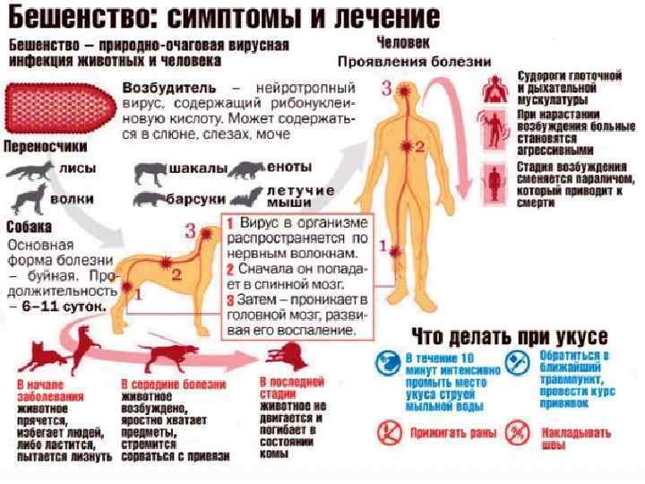 Профилактика борьбу с источниками инфекции и предупреждение заболевания человека-ликвидация бешенства среди животных. Предупреждение бешенства у человека осуществляют с помощью антирабических вакцин (мозговых и тканевокультуральных), антирабического иммуноглобулина. Разрабатываются вакцины, полученные методом генной инженерии. При укусе бешеным или подозрительным животным проводят первичную обработку раны с промыванием ее мыльным раствором и смазыванием концентрированным спиртовым раствором йода. Хирургическое иссечение краев раны с наложением швов противопоказано, так как приводит к дополнительной травматизации и укорочению инкубации. После оказания первой помощи больного немедленно направляют на пастеровский пункт.