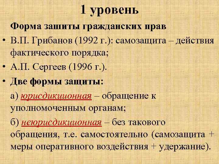 1 уровень Форма зашиты гражданских прав • В. П. Грибанов (1992 г. ): самозащита – действия фактического порядка; • А. П. Сергеев (1996 г. ). • Две формы защиты: а) юрисдикционная – обращение к уполномоченным органам; б) неюрисдикционная – без такового обращения, т. е. самостоятельно (самозащита + меры оперативного воздействия + удержание).