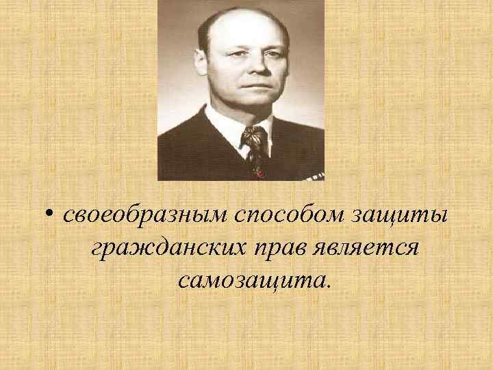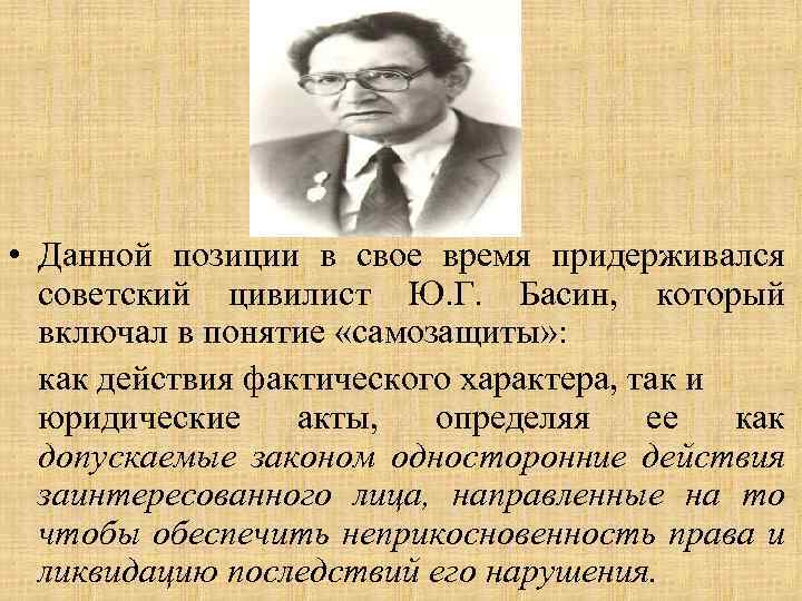 • Данной позиции в свое время придерживался советский цивилист Ю. Г. Басин, который включал в понятие «самозащиты» : как действия фактического характера, так и юридические акты, определяя ее как допускаемые законом односторонние действия заинтересованного лица, направленные на то чтобы обеспечить неприкосновенность права и ликвидацию последствий его нарушения.