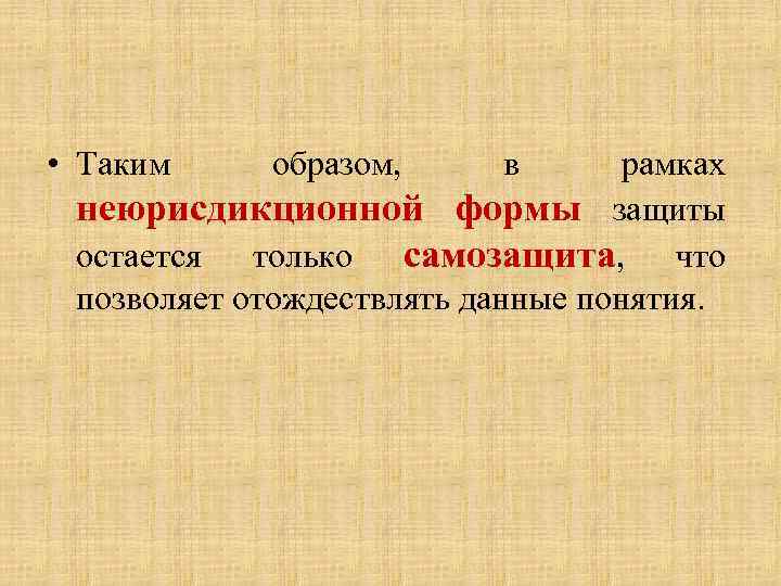 • Таким образом, в рамках неюрисдикционной формы защиты остается только самозащита, что позволяет отождествлять данные понятия.