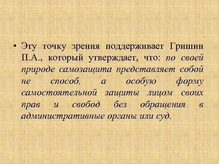 • Эту точку зрения поддерживает Гришин П. А. , который утверждает, что: по своей природе самозащита представляет собой не способ, а особую форму самостоятельной защиты лицом своих прав и свобод без обращения в административные органы или суд.