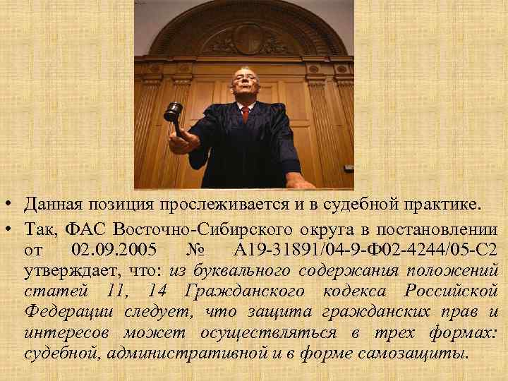 • Данная позиция прослеживается и в судебной практике. • Так, ФАС Восточно-Сибирского округа в постановлении от 02. 09. 2005 № А 19 -31891/04 -9 -Ф 02 -4244/05 -С 2 утверждает, что: из буквального содержания положений статей 11, 14 Гражданского кодекса Российской Федерации следует, что защита гражданских прав и интересов может осуществляться в трех формах: судебной, административной и в форме самозащиты.