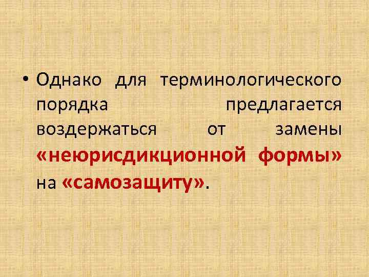 • Однако для терминологического порядка предлагается воздержаться от замены «неюрисдикционной формы» на «самозащиту» .