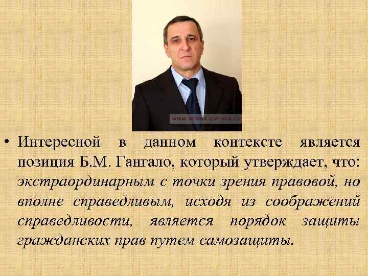 • Интересной в данном контексте является позиция Б. М. Гангало, который утверждает, что: экстраординарным с точки зрения правовой, но вполне справедливым, исходя из соображений справедливости, является порядок защиты гражданских прав путем самозащиты.