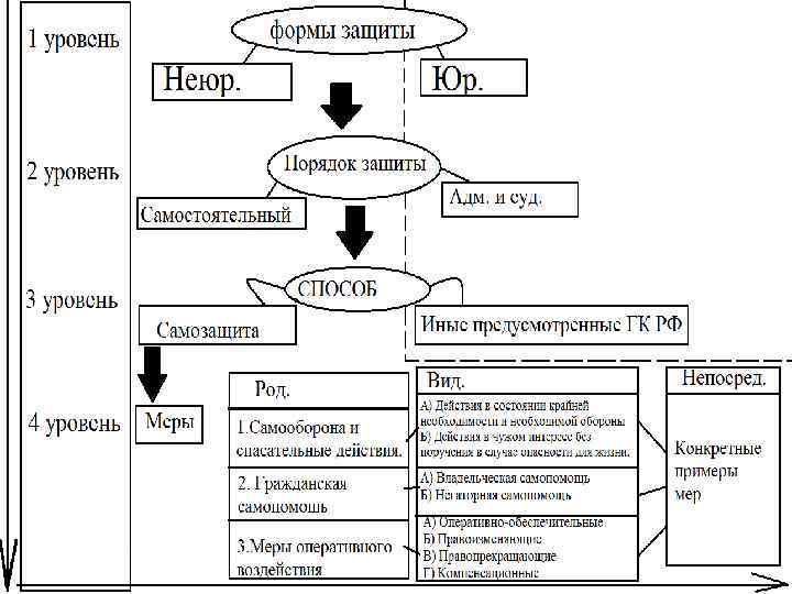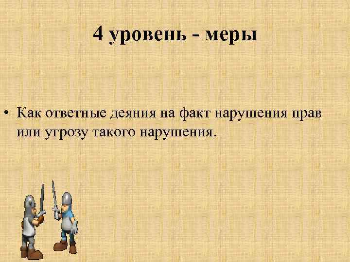 4 уровень - меры • Как ответные деяния на факт нарушения прав или угрозу такого нарушения.