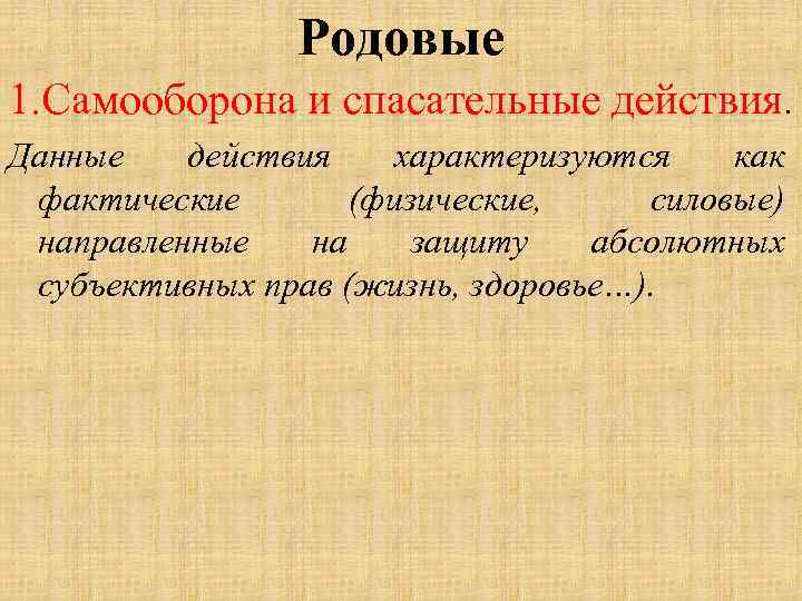 Родовые 1. Самооборона и спасательные действия. Данные действия характеризуются как фактические (физические, силовые) направленные на защиту абсолютных субъективных прав (жизнь, здоровье…).