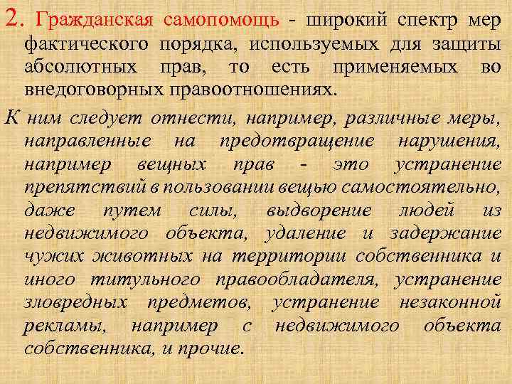 2. Гражданская самопомощь - широкий спектр мер фактического порядка, используемых для защиты абсолютных прав, то есть применяемых во внедоговорных правоотношениях. К ним следует отнести, например, различные меры, направленные на предотвращение нарушения, например вещных прав - это устранение препятствий в пользовании вещью самостоятельно, даже путем силы, выдворение людей из недвижимого объекта, удаление и задержание чужих животных на территории собственника и иного титульного правообладателя, устранение зловредных предметов, устранение незаконной рекламы, например с недвижимого объекта собственника, и прочие.
