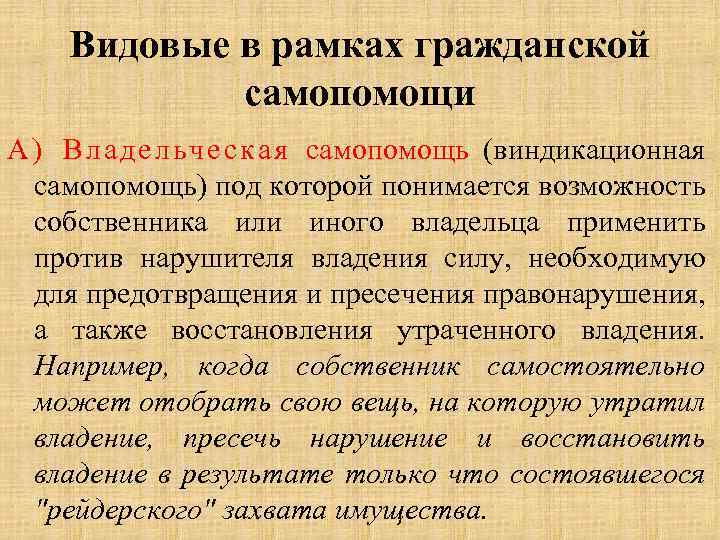 Видовые в рамках гражданской самопомощи А) Влад ельческая самопомощь (виндикационная самопомощь) под которой понимается возможность собственника или иного владельца применить против нарушителя владения силу, необходимую для предотвращения и пресечения правонарушения, а также восстановления утраченного владения. Например, когда собственник самостоятельно может отобрать свою вещь, на которую утратил владение, пресечь нарушение и восстановить владение в результате только что состоявшегося "рейдерского" захвата имущества.