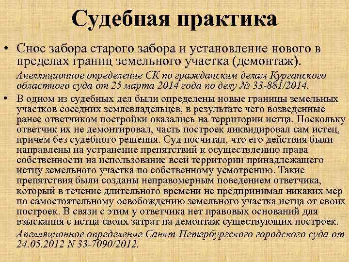 Судебная практика • Снос забора старого забора и установление нового в пределах границ земельного участка (демонтаж). Апелляционное определение СК по гражданским делам Курганского областного суда от 25 марта 2014 года по делу № 33 -881/2014. • В одном из судебных дел были определены новые границы земельных участков соседних землевладельцев, в результате чего возведенные ранее ответчиком постройки оказались на территории истца. Поскольку ответчик их не демонтировал, часть построек ликвидировал сам истец, причем без судебного решения. Суд посчитал, что его действия были направлены на устранение препятствий к осуществлению права собственности на использование всей территории принадлежащего истцу земельного участка по собственному усмотрению. Такие препятствия были созданы неправомерным поведением ответчика, который в течение длительного времени не предпринимал никаких мер по самостоятельному освобождению земельного участка истца от своих построек. В связи с этим у ответчика нет правовых оснований для взыскания с истца своих затрат на демонтаж существующих построек. Апелляционное определение Санкт-Петербургского городского суда от 24. 05. 2012 N 33 -7090/2012.