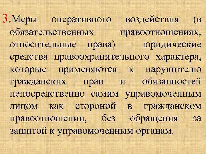 3. Меры оперативного воздействия (в обязательственных правоотношениях, относительные права) – юридические средства правоохранительного характера, которые применяются к нарушителю гражданских прав и обязанностей непосредственно самим управомоченным лицом как стороной в гражданском правоотношении, без обращения за защитой к управомоченным органам.