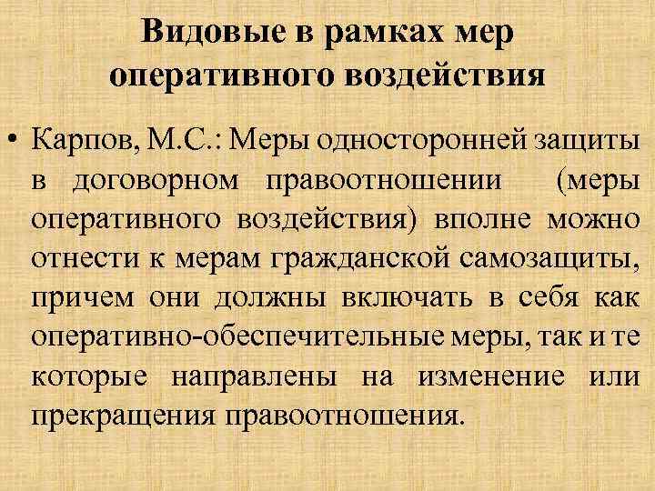 Видовые в рамках мер оперативного воздействия • Карпов, М. С. : Меры односторонней защиты в договорном правоотношении (меры оперативного воздействия) вполне можно отнести к мерам гражданской самозащиты, причем они должны включать в себя как оперативно-обеспечительные меры, так и те которые направлены на изменение или прекращения правоотношения.