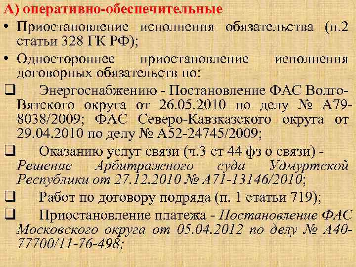 А) оперативно-обеспечительные • Приостановление исполнения обязательства (п. 2 статьи 328 ГК РФ); • Одностороннее приостановление исполнения договорных обязательств по: q Энергоснабжению - Постановление ФАС Волго. Вятского округа от 26. 05. 2010 по делу № А 798038/2009; ФАС Северо-Кавзказского округа от 29. 04. 2010 по делу № А 52 -24745/2009; q Оказанию услуг связи (ч. 3 ст 44 фз о связи) - Решение Арбитражного суда Удмуртской Республики от 27. 12. 2010 № А 71 -13146/2010; q Работ по договору подряда (п. 1 статьи 719); q Приостановление платежа - Постановление ФАС Московского округа от 05. 04. 2012 по делу № А 4077700/11 -76 -498;