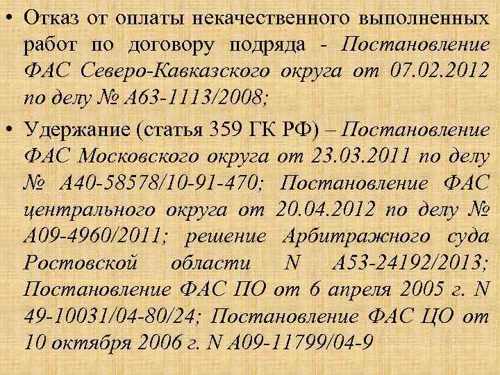 • Отказ от оплаты некачественного выполненных работ по договору подряда - Постановление ФАС Северо-Кавказского округа от 07. 02. 2012 по делу № А 63 -1113/2008; • Удержание (статья 359 ГК РФ) – Постановление ФАС Московского округа от 23. 03. 2011 по делу № А 40 -58578/10 -91 -470; Постановление ФАС центрального округа от 20. 04. 2012 по делу № А 09 -4960/2011; решение Арбитражного суда Ростовской области N А 53 -24192/2013; Постановление ФАС ПО от 6 апреля 2005 г. N 49 -10031/04 -80/24; Постановление ФАС ЦО от 10 октября 2006 г. N А 09 -11799/04 -9