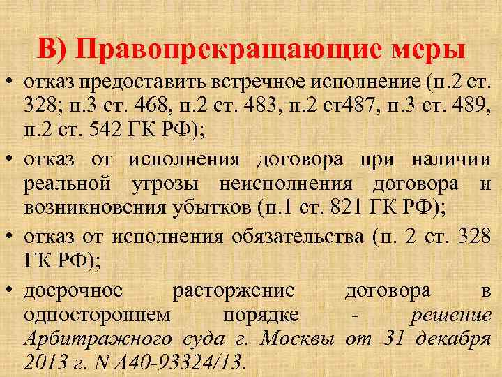 В) Правопрекращающие меры • отказ предоставить встречное исполнение (п. 2 ст. 328; п. 3 ст. 468, п. 2 ст. 483, п. 2 ст487, п. 3 ст. 489, п. 2 ст. 542 ГК РФ); • отказ от исполнения договора при наличии реальной угрозы неисполнения договора и возникновения убытков (п. 1 ст. 821 ГК РФ); • отказ от исполнения обязательства (п. 2 ст. 328 ГК РФ); • досрочное расторжение договора в одностороннем порядке - решение Арбитражного суда г. Москвы от 31 декабря 2013 г. N А 40 -93324/13.
