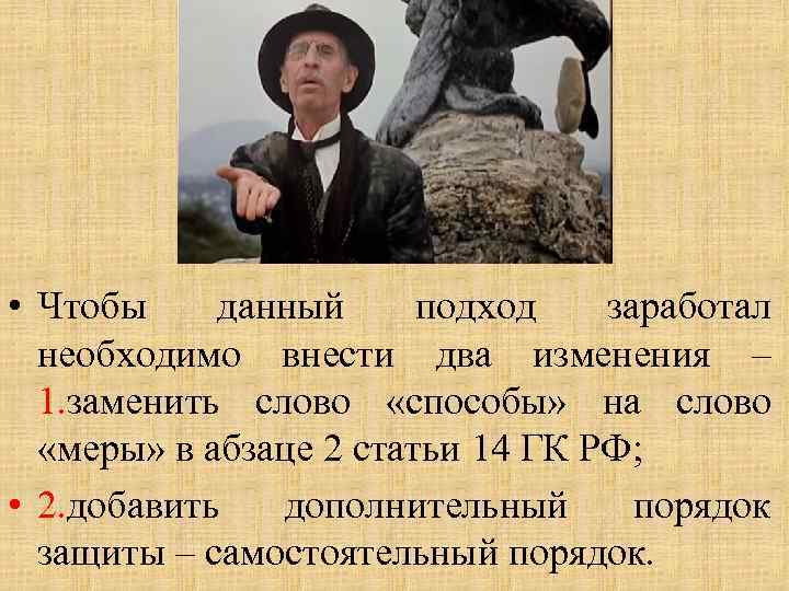 • Чтобы данный подход заработал необходимо внести два изменения – 1. заменить слово «способы» на слово «меры» в абзаце 2 статьи 14 ГК РФ; • 2. добавить дополнительный порядок защиты – самостоятельный порядок.