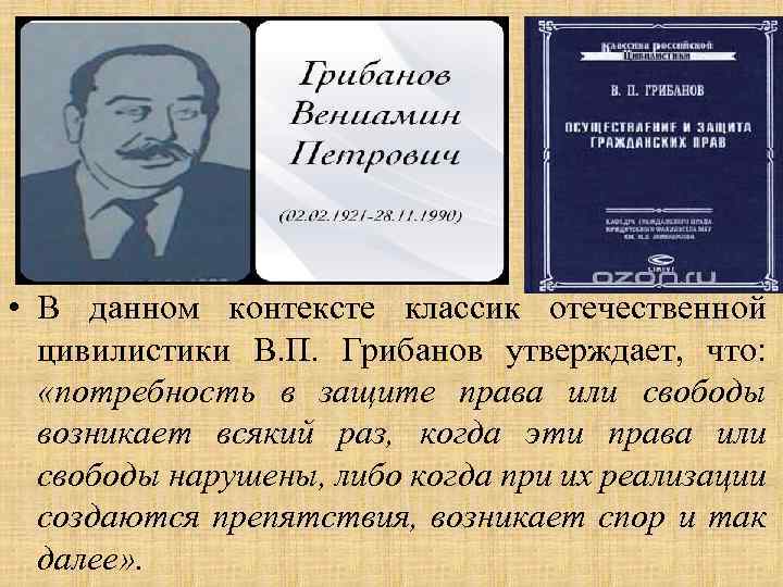 • В данном контексте классик отечественной цивилистики В. П. Грибанов утверждает, что: «потребность в защите права или свободы возникает всякий раз, когда эти права или свободы нарушены, либо когда при их реализации создаются препятствия, возникает спор и так далее» .