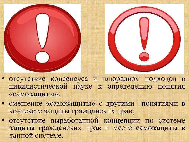 • отсутствие консенсуса и плюрализм подходов в цивилистической науке к определению понятия «самозащиты» ; • смешение «самозащиты» с другими понятиями в контексте защиты гражданских прав; • отсутствие выработанной концепции по системе защиты гражданских прав и месте самозащиты в данной системе.
