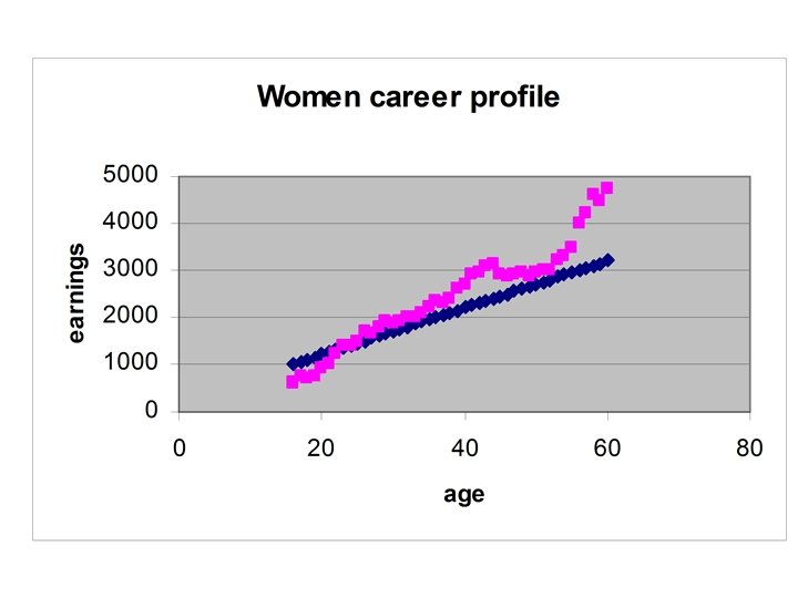 Women in the labour force are not a random sample • “Women’s labour force participation rates are highly dependent on age. ” Gourieroux (2000) • Labour participation is in general lower for women aged: – 16 -20 because some women are still studying – 25 -44 for work interruption linked to children – 55 -60 because some women prefer to retire early • Presumably the earnings observed for women aged – 16 -20 are lower than if all women worked – 25 -44 are higher because women with higher earnings are less incline to work interruptions – 55 -60 are higher because women with higher earnings are less incline to retire early