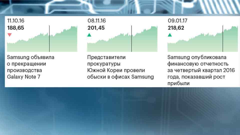 • Накануне самого ожидаемого в 2016 году старта продаж акции Samsung Electronics Co. взлетели на рекордные 4, 7%. Капитализация корпорации тогда составила 232 трлн вон ($210 млрд), а рыночная стоимость Samsung была в пять раз выше японской Sony Corp.
