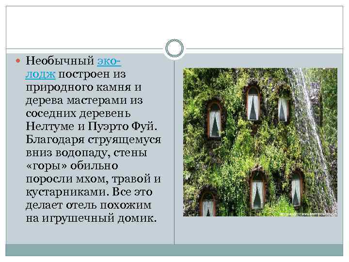 Необычный эко- лодж построен из природного камня и дерева мастерами из соседних деревень Нелтуме и Пуэрто Фуй. Благодаря струящемуся вниз водопаду, стены «горы» обильно поросли мхом, травой и кустарниками. Все это делает отель похожим на игрушечный домик.