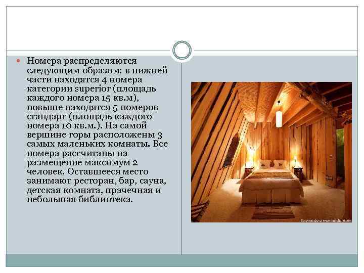 Номера распределяются следующим образом: в нижней части находятся 4 номера категории superior (площадь каждого номера 15 кв. м), повыше находятся 5 номеров стандарт (площадь каждого номера 10 кв. м. ). На самой вершине горы расположены 3 самых маленьких комнаты. Все номера рассчитаны на размещение максимум 2 человек. Оставшееся место занимают ресторан, бар, сауна, детская комната, прачечная и небольшая библиотека.