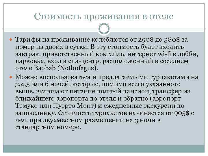 Стоимость проживания в отеле Тарифы на проживание колеблются от 290$ до 380$ за номер на двоих в сутки. В эту стоимость будет входить завтрак, приветственный коктейль, интернет wi-fi в лобби, парковка, вход в спа-центр, расположенный в соседнем отеле Baobab (Nothofagus). Можно воспользоваться и предлагаемыми турпакетами на 3, 4, 5 или 6 ночей, которые, помимо всего указанного выше, включают питание полный пансион, трансфер из ближайшего аэропорта до отеля и обратно (аэропорт Темуко или Пуэрто Монт) и ежедневные экскурсии по заповеднику. Стоимость турпакетов начинается от 905$ с чел. при двухместном размещении на 3 ночи в стандартном номере.