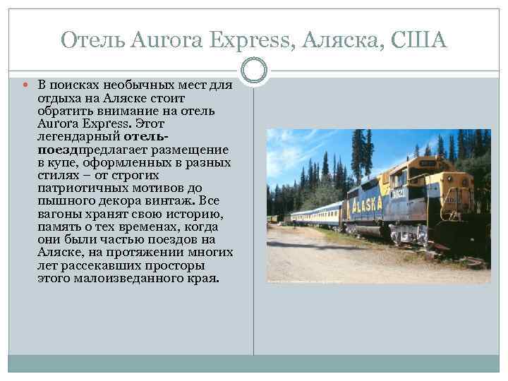 Отель Aurora Express, Аляска, США В поисках необычных мест для отдыха на Аляске стоит обратить внимание на отель Aurora Express. Этот легендарный отельпоездпредлагает размещение в купе, оформленных в разных стилях – от строгих патриотичных мотивов до пышного декора винтаж. Все вагоны хранят свою историю, память о тех временах, когда они были частью поездов на Аляске, на протяжении многих лет рассекавших просторы этого малоизведанного края.
