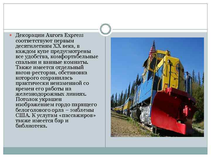Декорации Aurora Express соответствуют первым десятилетиям ХХ века, в каждом купе предусмотрены все удобства, комфортабельные спальни и ванные комнаты. Также имеется отдельный вагон-ресторан, обстановка которого сохранилась практически неизменной со времен его работы на железнодорожных линиях. Потолок украшен изображением гордо парящего белоголового орла – эмблемы США. К услугам «пассажиров» также имеется бар и библиотека.